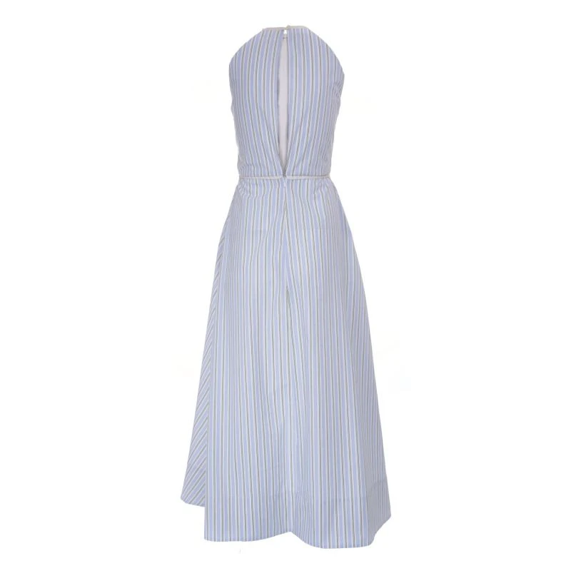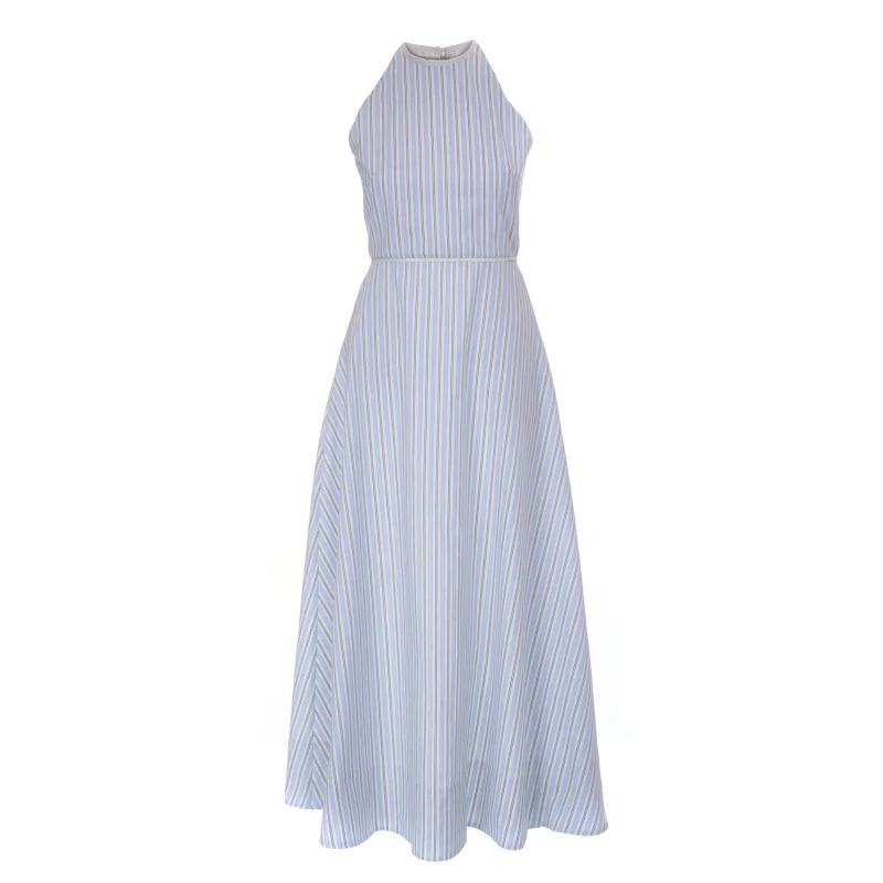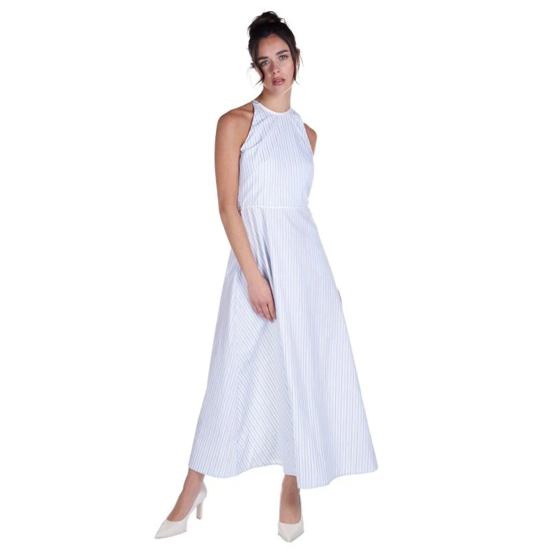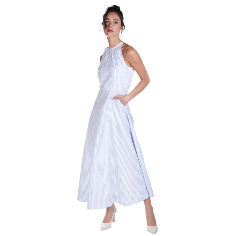 In a striped print and that pure cotton freshness, this sleeveless long dress by Sofia Tsereteli makes an impact on any occasion with a minimalist elegance. Delicate details make all the difference in this design and a narrow white border at the neckline is echoed again at the waistline. The bodice is softly fitted, and the center back opening is fastened with mother-of-pearl buttons, and an invisible zip that starts from the waist. The flared skirt is finished with a broad hem with contrasting white internal fabric.