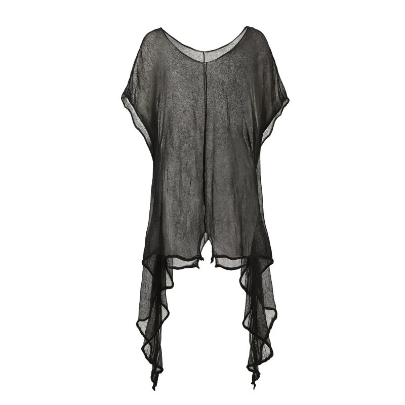 Oversized, asymmetric top, made of fine cotton. This knitted sheer top features raglan short sleeves, V- neck cut, front seam, longer sides and can be worn made from both sides (front & back).