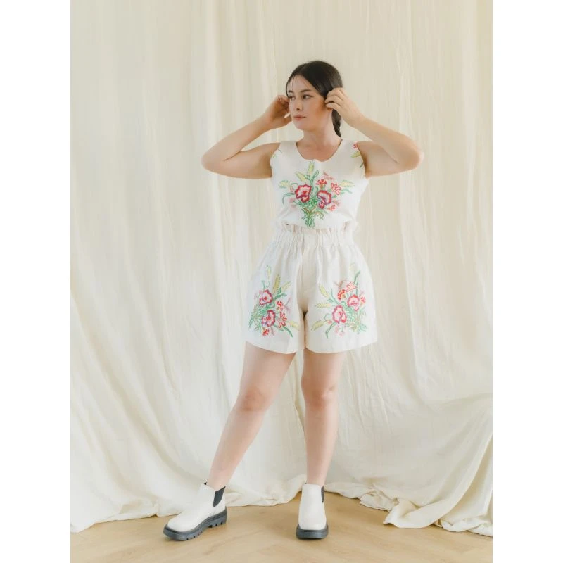 The high rise shorts come in a beautiful white color with an overall elastic paperbag waist and a zipper at the front. The cotton fabric is adorned with bright floral embroidery, adding a touch of elegance to the set. This upcycled and sustainable outfit is flawless and truly unique, making it a special addition to your wardrobe.