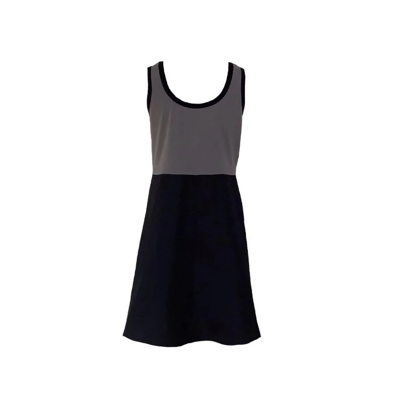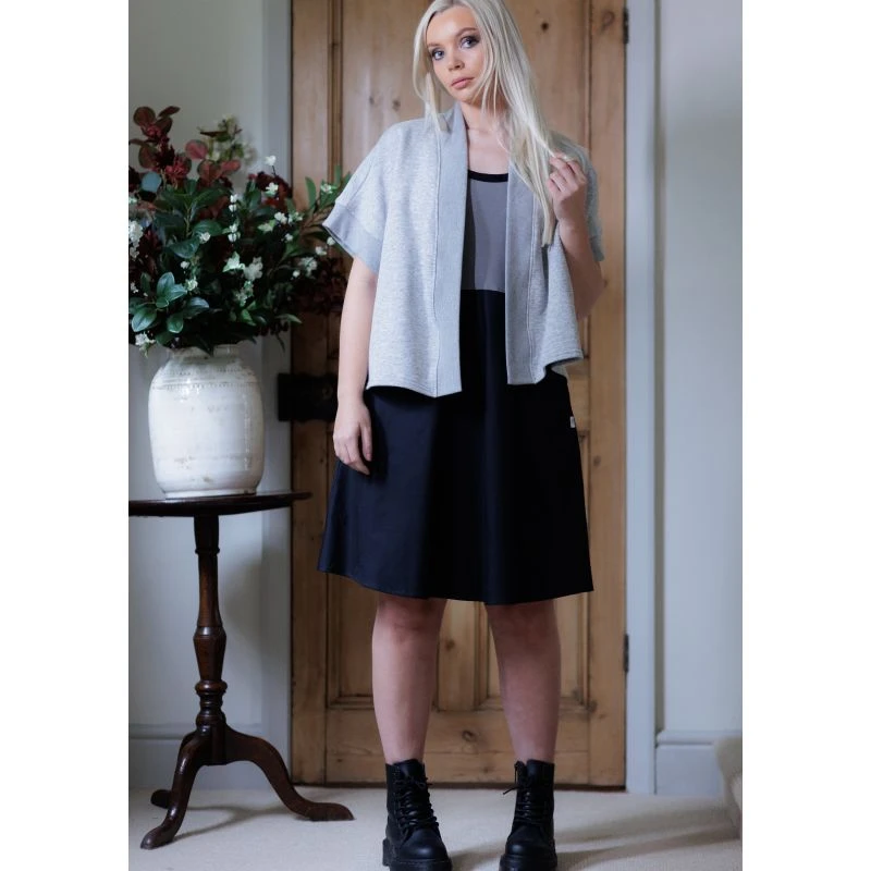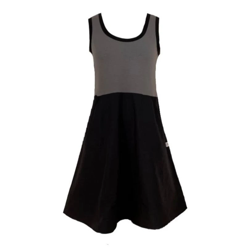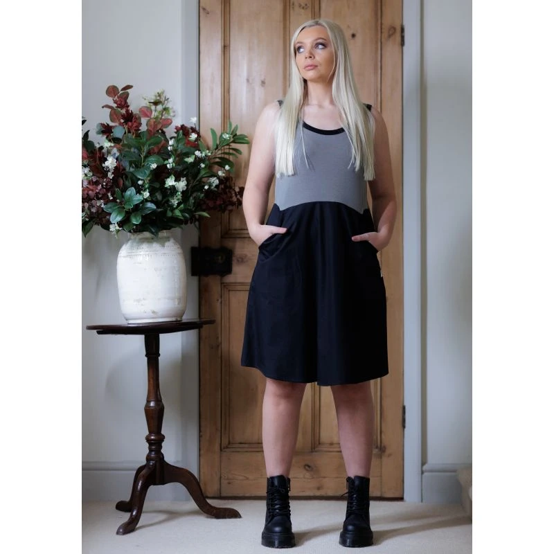 Tale: Our playful knee length Vada Dress is a perfect daytime essential, made for warmer days. The breathable two colour fabric combo adds interest and comfort with the bodice made from organic cotton jersey with lycra and the skirt a crisp woven organic cotton. This sleeveless scoop necked dress has black contrast around the neckline and sleeves. The angled pockets are a great asset for any activity. Team with our Signature Twilight Shrug or Shruglet for an edgy look. This garment is made in Great Britain by our Frock Tales team.