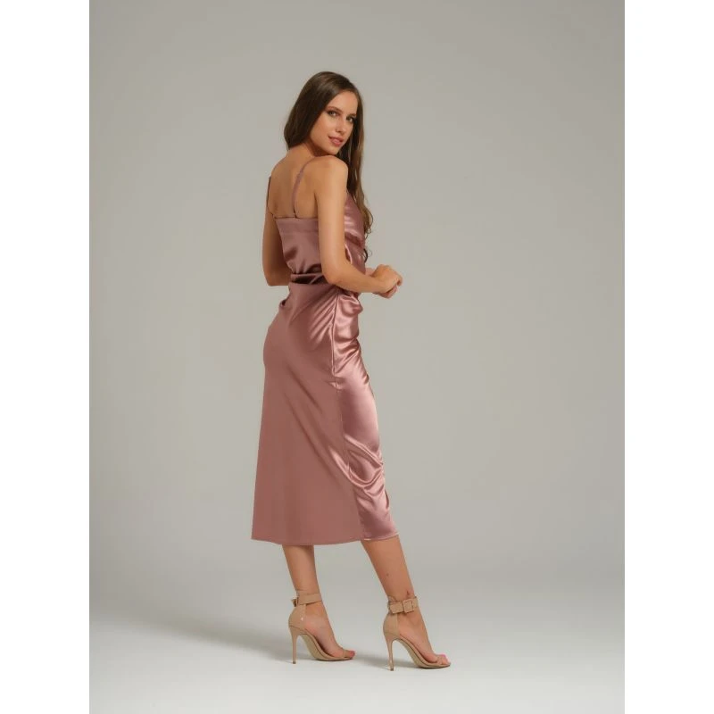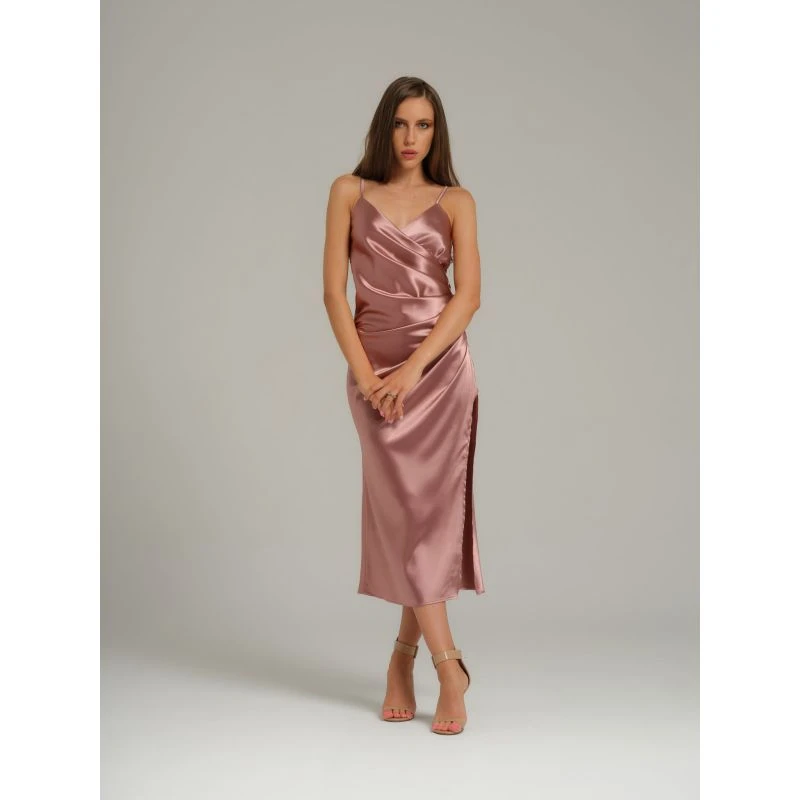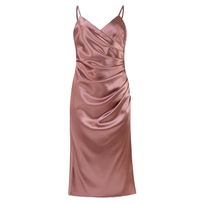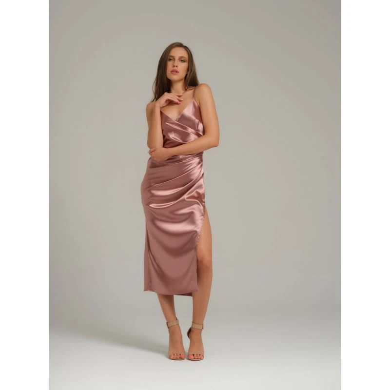 The flattering silhouette is crafted from luxe satin and distinctively detailed with V-neckline and thigh-high side slit.