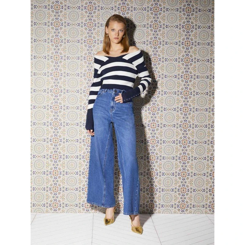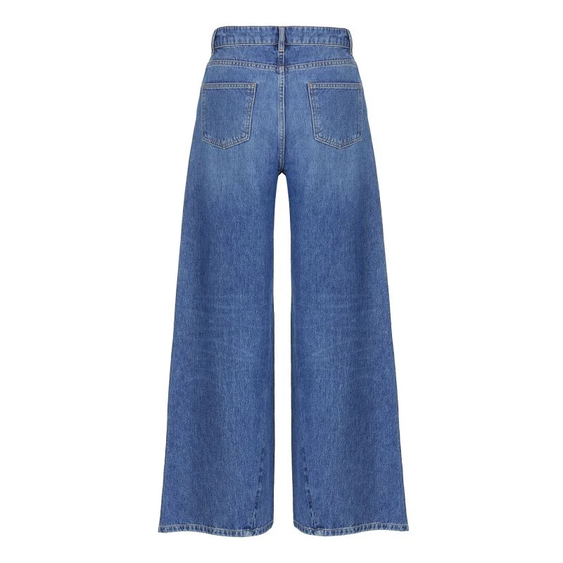 Wide leg jeans with pocket detail. Zip and snap button closure.